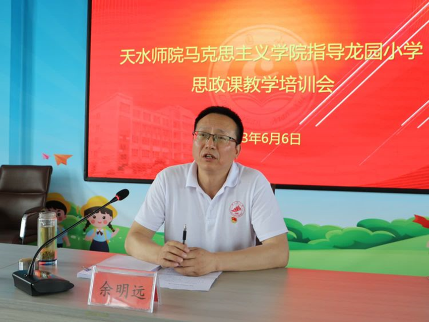 培训会有幸邀请到了天水师范学院Beat365官方网站余明远副院长。参加会议的还有道南小学、桥南小学、马跑泉中校、渭南中校、中滩中校、龙园小学的党政班子和思政课教师,共计50余人。